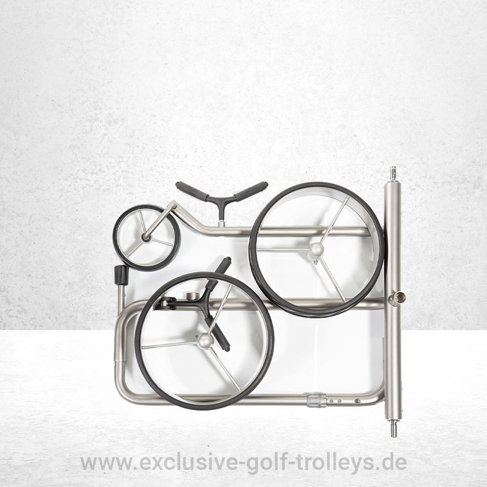 Der komfortable Golftrolley mit nur einer Steckverbindung und dem besonders flachen Packmaß von 65x60x10 cm passt in fast jeden Sportwagen-Kofferraum.