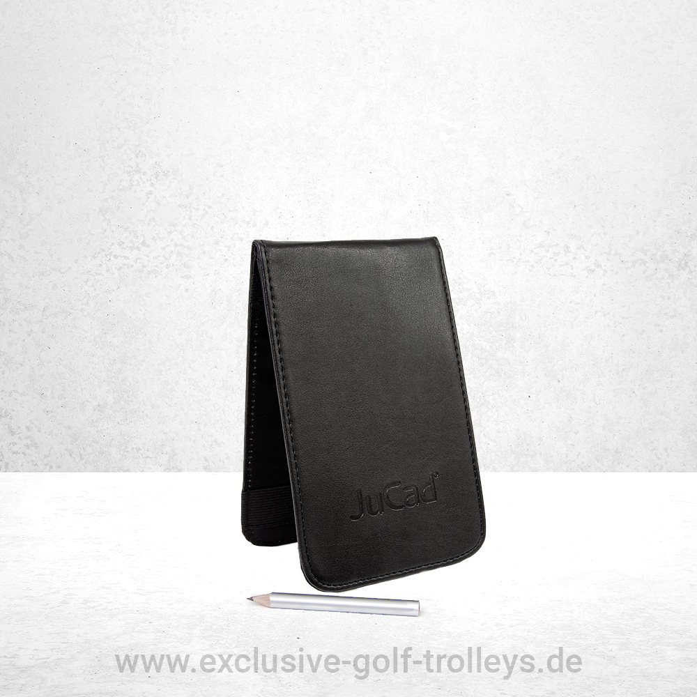 Elegante Scorekartenmappe in exklusivem, Schwarzem Lederdesign, mit geprägtem JuCad Logo auf der Vorderseite.