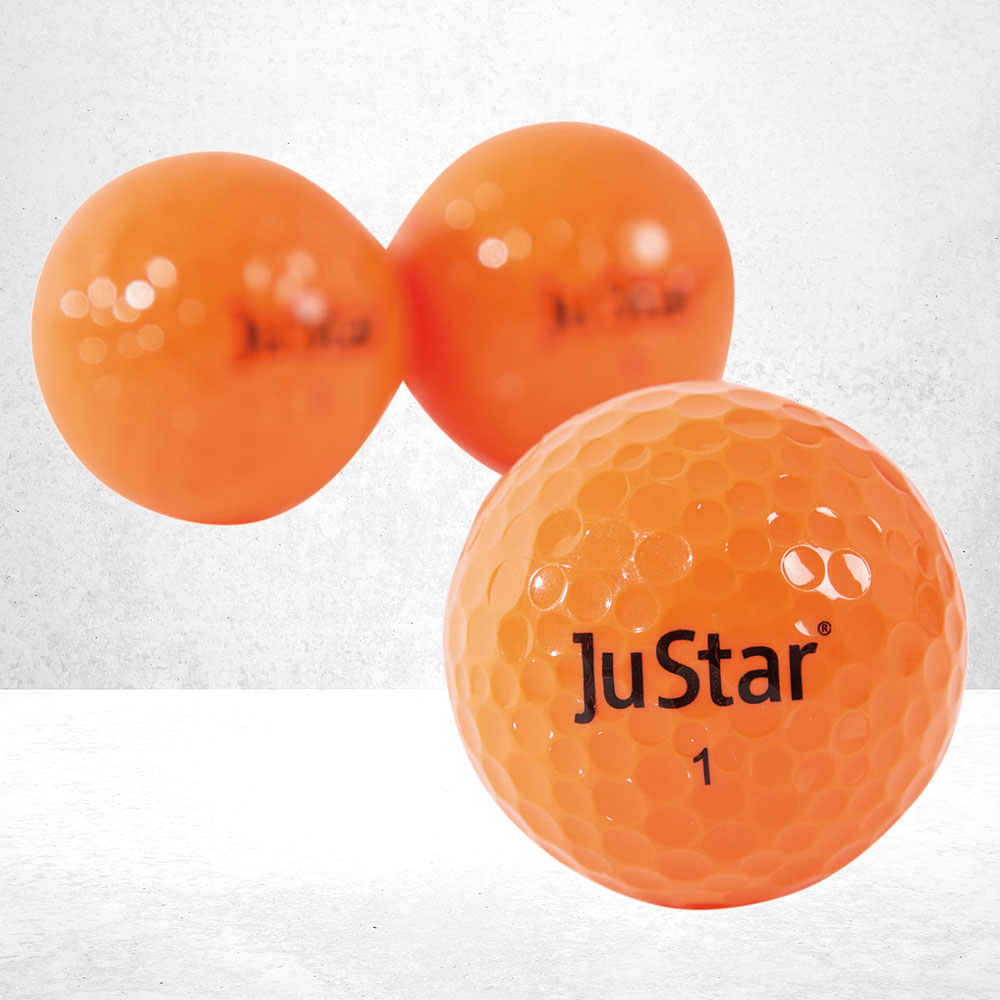 Mit perfektem Feeling vom Abschlag bis zum Grün, mit den leuchtend orangen JuStar Golfbällen.