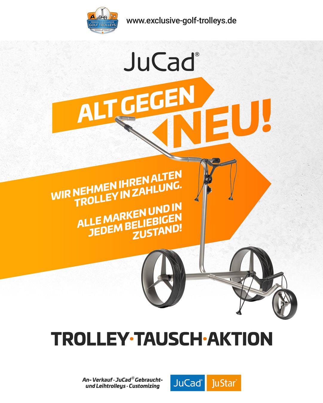 Ob JuCad oder JuStar, E-Trolley oder Handwagen – ganz gleich ob fahrbereit oder defekt. Profitieren Sie jetzt von unserer exklusiven Tauschaktion und sichern Sie sich Ihre Inzahlungnahmeprämie beim Kauf eines neuen JuCad Trolleys zum Listenpreis.